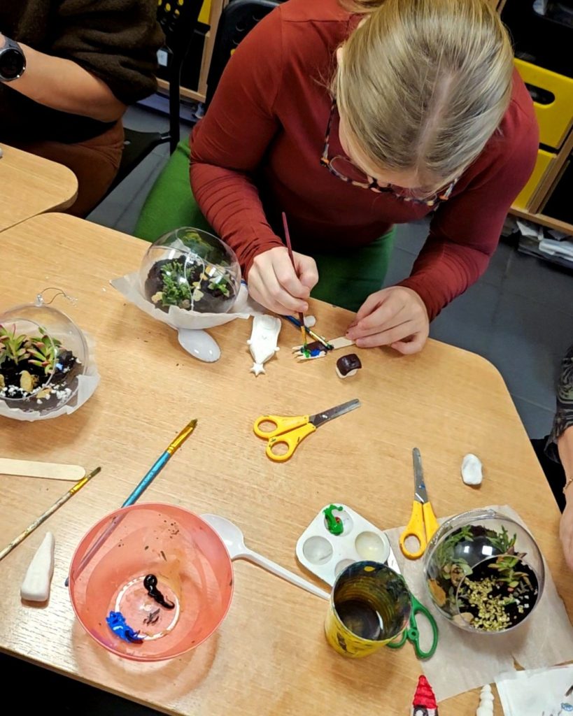 Drugie warsztaty poprowadziłam już sama, a skupiały się one na tworzeniu ozdób świątecznych. Wspólnie z uczestnikami udekorowaliśmy przezroczyste, wiszące bańki zawierające otwarte mini terrarium świąteczne z małymi sukulentami. Dla lepszego efektu chętni zrobili również małe domki z modeliny i uzupełnili dekoracje złotymi kamyczkami. Zajęcia łączyły kreatywność i pracę manualną, oferując spokojny i oryginalny sposób na wprowadzenie się w świąteczny nastrój.